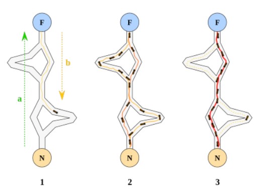 Auf Anfrage des New Yorker Künstlers Kyle Kombs, habe ich ein Grasshoppercode für selbst wachsende Skulpturen geschrieben. Hierbei habe ich für die Modellierung einen Multiagenten-Algorithmus, den Ameisen-Algorithmus verwendet. „Bei der Futtersuche scheiden einzelne Ameisen entlang ihres Weges Pheromone aus. Andere Ameisen wählen wahrscheinlicher einen Weg mit höherer Pheromonkonzentration. Verbindet man in einem Experiment eine Futterquelle [F] mit zwei unterschiedlich langen Wegen mit dem Nest [N], so betreten die Ameisen auf ihrer Suche nach Futter beide Wege etwa gleich häufig. Die Ameisen auf dem kürzeren Weg kehren jedoch schneller von der Futterstelle zurück, so dass mit der Zeit auf dem kürzesten Pfad eine höhere Pheromonkonzentration als auf dem anderen vorherrscht. In der Folge wählen die nachkommenden Ameisen bevorzugt diesen Weg: Sie scheinen entlang einer Straße zu laufen, eine Ameisenstraße ist entstanden.“